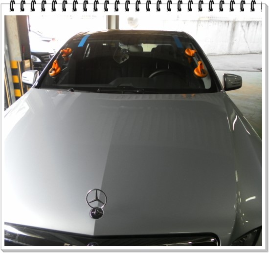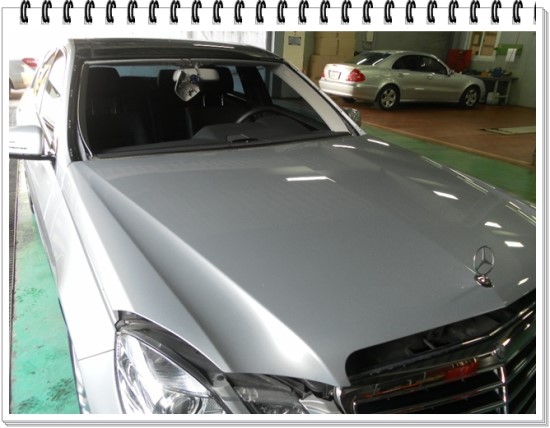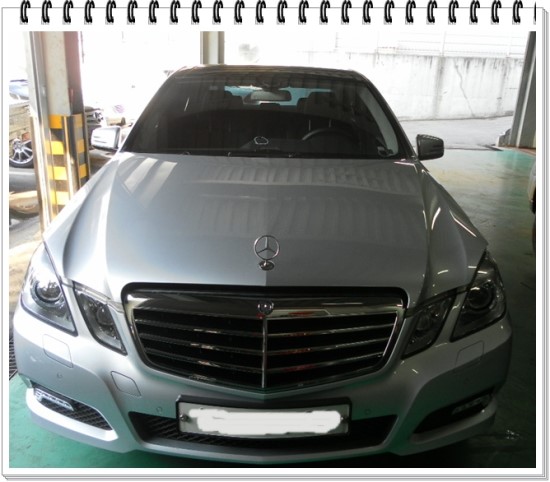 벤츠E300 전면유리 정품유리와 브러쉬 카울그릴 부착모습입니다
